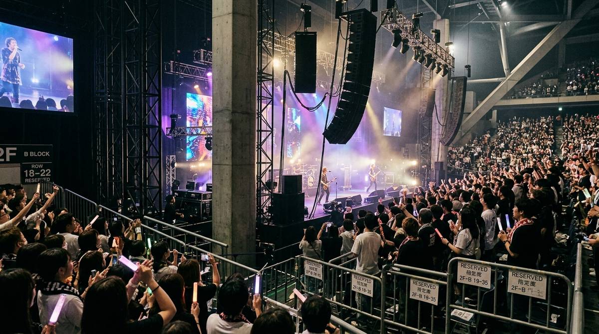ライブの迫力を左右する音響機材も、座席の条件を大きく左右する要因です。ステージの両脇にはメインとなるスピーカー(ラインアレイ)が吊り下げられており、ここから会場全体へ音が届けられます。ステージサイド席はこのスピーカーの「真横」や「裏側」に位置することが多いのです。