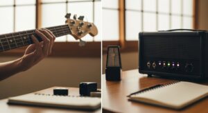 メトロノームはリズムを身体に覚えさせるための最もシンプルな道具です。まずは遅めのテンポで、1拍ごとにダウンだけを合わせる練習から始めます。テンポに追いつけない場合は無理せず落としてください。