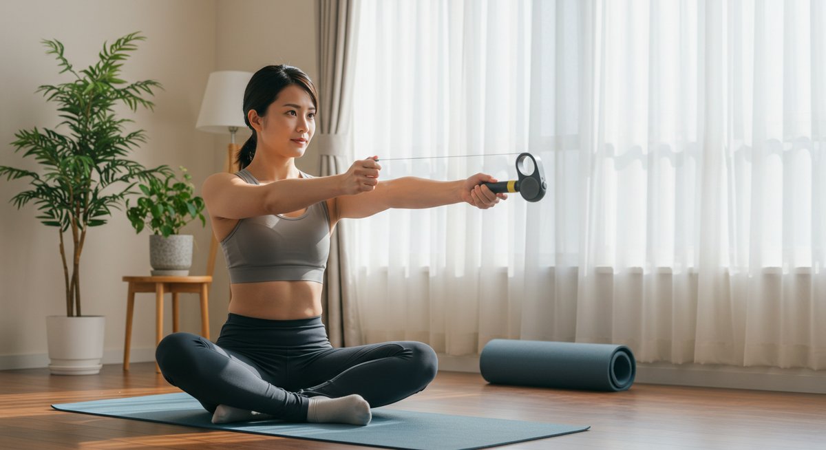 一方、背中を鍛えるには「ローイング」動作が効果的です。エキスパンダーを足にかけ、両手でグリップを握り体の方に引き寄せます。肩甲骨をしっかり寄せることを意識すると、より効果が高まります。どちらのトレーニングも、負荷を調整しながら徐々に回数やセット数を増やすと良いでしょう。