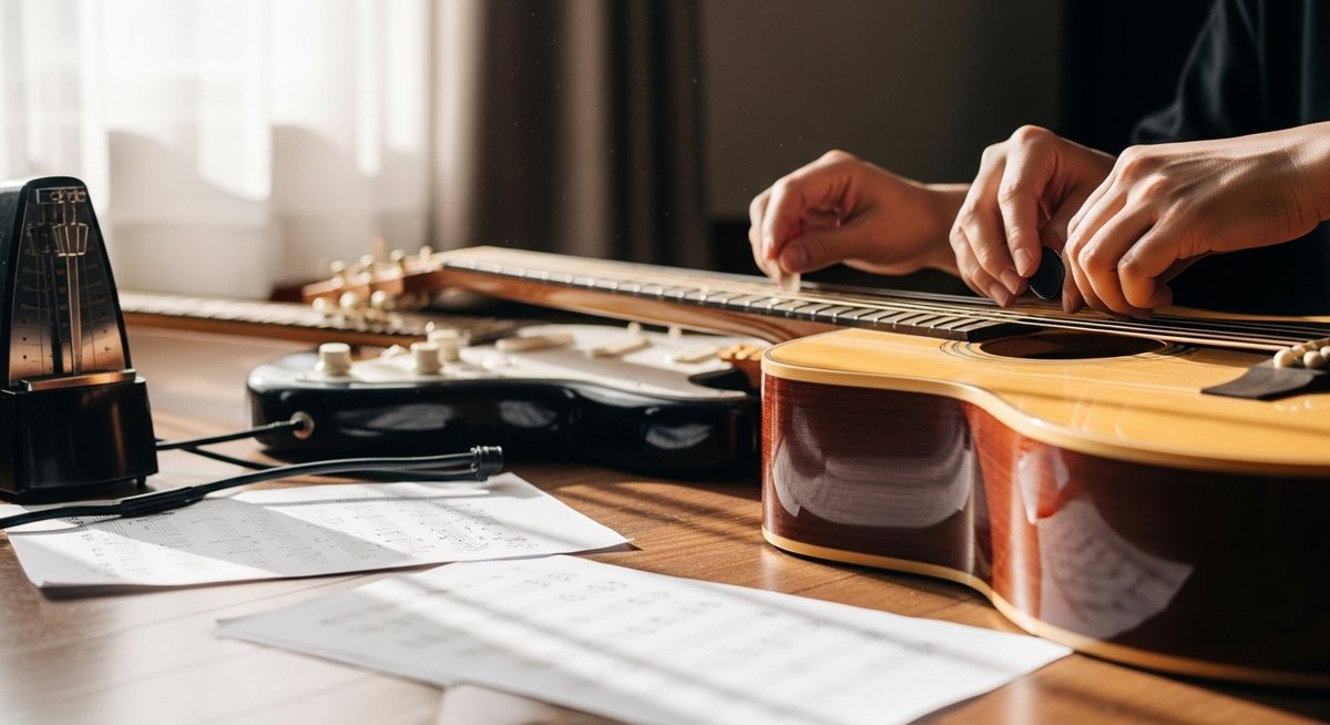- 基本のフォーム確認:左手の親指位置や右手のピッキングを鏡や録画でチェックし、無駄な力が入っていないか確かめてください。
