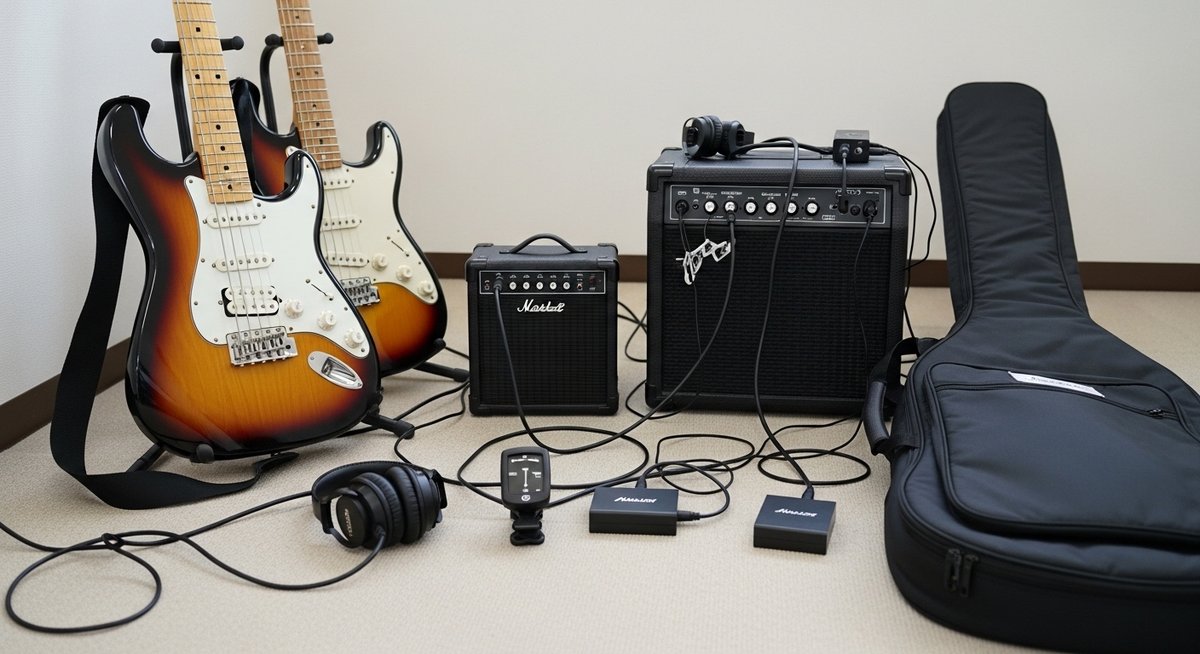 楽器本体だけでなく、演奏に必要な周辺機器のセット内容を確認することも、軽音とバンドの違いを考慮する上で欠かせません。楽器を始めてすぐに音を出して練習するためには、アンプ、シールドケーブル、チューナー、ピックなどの付属品が必須となります。特に初心者の場合、何を個別に揃えれば良いか判断が難しいため、メーカーが用意している入門セットを選択肢に入れるのは非常に賢い判断と言えます。