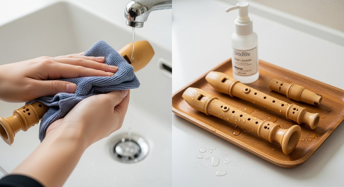 木製リコーダーの場合は洗剤の使用を最小限にし、素早くすすぐことを心がけてください。すすぎ後はすぐに水分を取り、風通しの良い場所で自然乾燥させます。